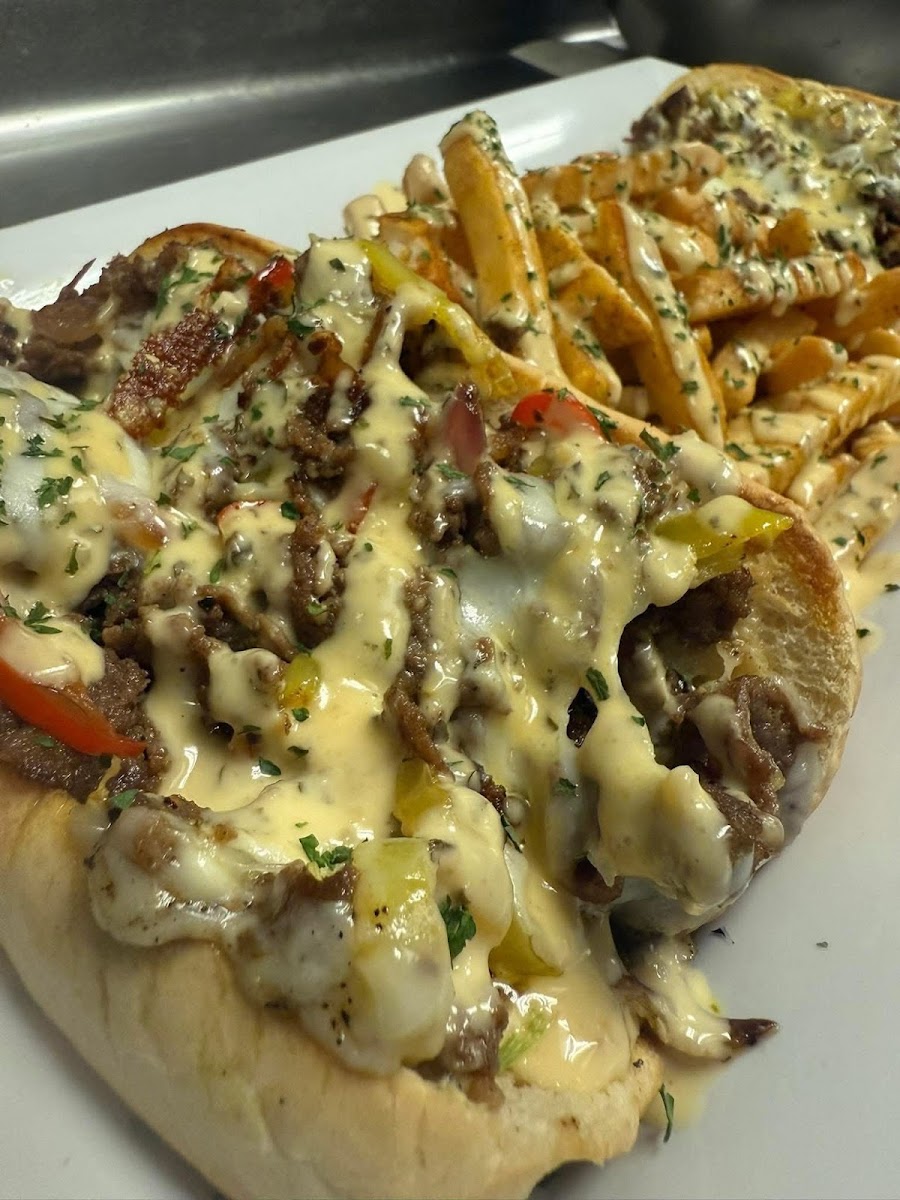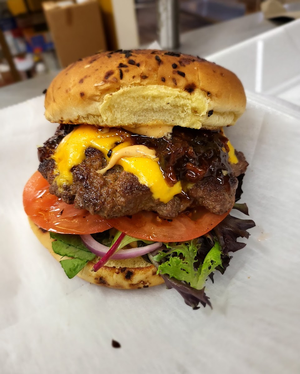 1/2 Pound Burger, Blended Cheese, Bacon Jam, Buddha Sauce. It's Also Paired With Loaded Fries.